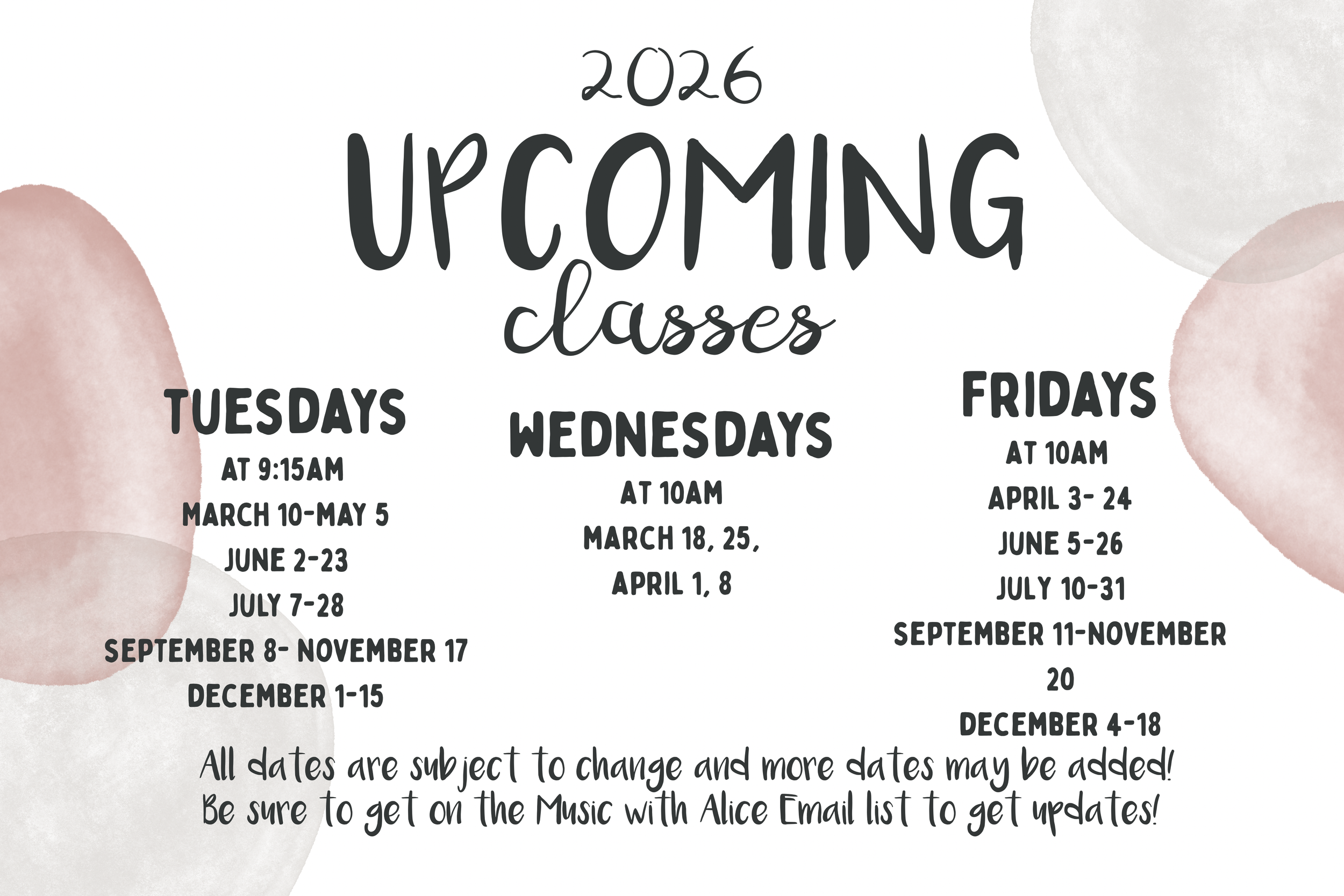 *Older siblings (6+) are welcomE! as long as they are not a distraction to class, they can come free of charge to watch/help.